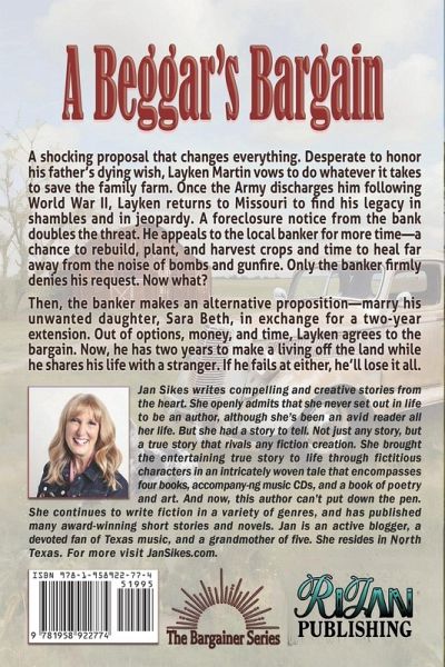 A shocking proposal that changes everything. Desperate to honor his father's dying wish, Layken Martin vows to do whatever it takes to save the family farm. Once the Army discharges him following World War II, Layken returns to Missouri to find his legacy in shambles and in jeopardy. A foreclosure notice from the bank doubles the threat. He appeals to the local banker for more time-a chance to rebuild, plant, and harvest crops and time to heal far away from the noise of bombs and gunfire. But the banker firmly denies his request. Now what? Then, the banker makes an alternative proposition-marry his unwanted daughter, Sara Beth, in exchange for a two-year extension. Out of options, money, and time, Layken agrees to the bargain. Now, he has two years to make a living off the land while he shares his life with a stranger. If he fails at either, he'll lose it all.