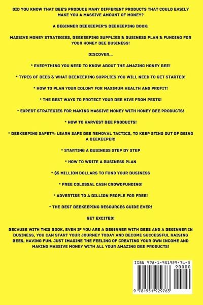 Did you know that Bee's produce many different products that could easily make you a massive amount of money? A Beginner Beekeeper's Beekeeping Book: Massive Money Strategies, Beekeeping Supplies & Business Plan & Funding for Your Honey Bee Business! Discover... * Everything you need to know about the Amazing Honey Bee! * Types of Bees & What Beekeeping Supplies you will need to get started! * How to plan Your Colony for maximum health and profit! * The best ways to protect your Bee Hive from Pests! * Expert Strategies for Making Massive Money with Honey Bee Products! * How to Harvest Bee Products! * Beekeeping Safety: Learn Safe bee removal tactics, to keep sting out of being a beekeeper! * Starting a Business Step by Step * How to Write a Business Plan * $5 Million Dollars to Fund Your Business * Free Colossal Cash Crowdfunding! * Advertise to a Billion People for Free! * The Best Beekeeping Resources Guide Ever! Get Excited! Because with this book, even if you are a beginner with bees and a beginner in business, you can start your journey today and become successful raising bees, having fun. Just imagine the feeling of creating your own income and making massive money with all your amazing bee products!