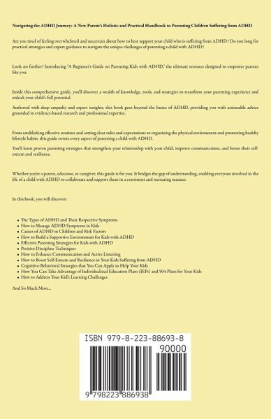 Navigating the ADHD Journey: A New Parent's Holistic and Practical Handbook to Parenting Children Suffering from ADHD Are you tired of feeling overwhelmed and uncertain about how to best support your child who is suffering from ADHD? Do you long for practical strategies and expert guidance to navigate the unique challenges of parenting a child with ADHD? Look no further! Introducing "A Beginner's Guide on Parenting Kids with ADHD," the ultimate resource designed to empower parents like you. Inside this comprehensive guide, you'll discover a wealth of knowledge, tools, and strategies to transform your parenting experience and unlock your child's full potential. Authored with deep empathy and expert insights, this book goes beyond the basics of ADHD, providing you with actionable advice grounded in evidence-based research and professional expertise. From establishing effective routines and setting clear rules and expectations to organizing the physical environment and promoting healthy lifestyle habits, this guide covers every aspect of parenting a child with ADHD. You'll learn proven parenting strategies that strengthen your relationship with your child, improve communication, and boost their self-esteem and resilience. But what sets this guide apart is its real-world solutions. No more searching for answers or feeling lost in a sea of conflicting information. "A Beginner's Guide on Parenting Kids with ADHD" offers step-by-step guidance that is both practical and compassionate. It equips you with the tools you need to create a harmonious and empowering environment that fosters your child's growth, resilience, and well-being. Whether you're a parent, educator, or caregiver, this guide is for you. It bridges the gap of understanding, enabling everyone involved in the life of a child with ADHD to collaborate and support them in a consistent and nurturing manner. In this book, you will discover: The Types of ADHD and Their Respective Symptoms How to Manage ADHD Symptoms in Kids Causes of ADHD in Children and Risk Factors How to Build a Supportive Environment for Kids with ADHD Effective Parenting Strategies for Kids with ADHD Positive Discipline Techniques How to Enhance Communication and Active Listening How to Boost Self-Esteem and Resilience in Your Kids Suffering from ADHD Cognitive-Behavioral Strategies that You Can Apply to Help Your Kids How You Can Take Advantage of Individualized Education Plans (IEPs) and 504 Plans for Your Kids How to Address Your Kid's Learning Challenges And So Much More... Investing in "A Beginner's Guide on Parenting Kids with ADHD" is an investment in your child's future. It empowers you to navigate this extraordinary journey with confidence and love. With this guide in hand, you can make a profound impact on your child's life and create a brighter, more successful future for them.