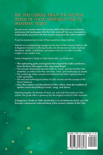Are you curious about the mystical world of Celtic spirituality and its relevance today? Do you ever wonder about the secrets held within the ancient forests and across the landscapes that the Celts revered? Are you interested in exploring the powerful role that women played in the Celtic tradition? If you've answered yes to any of these questions, keep reading! Embark on an enlightening voyage into the heart of this ancient tradition with A Beginner's Guide to Celtic Spirituality: An Introduction to Celtic Spiritual Mysteries, Myths, and Rituals, and explore how we can draw on Celtic insights in our modern lives. Inside A Beginner's Guide to Celtic Spirituality, you'll discover: The captivating gods and legends that shaped the Celtic worldview, from the fierce Morrígan to the venerated Brigid. The intricate relationship between folklore, fairies, and the land the Celts inhabited, as well as how they saw trees, rivers, and landscapes as sacred. The symbology of key animals and creatures that held a special place in Celtic spirituality. The real and mythological stories of Celtic women and the concept of the Divine Feminine. How the creative arts flourished in Celtic culture, from the tradition of spoken-word storytelling to music, song, and dance. Weaving together the threads of ritual, art, and myth that made up Celtic culture, this guide offers a gateway into the rich and mysterious world of the Celtic mysteries. A Beginner's Guide to Celtic Spirituality is an invitation to enrich your life through a deepened understanding of the ancient wisdom of the Celts.
