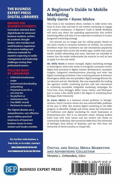 This book is for marketers (from newbies to CMO level) who want to learn why and how to use mobile marketing to engage and convert consumers. A Beginner's Guide to Mobile Marketing will teach you about the exploding opportunities that mobile marketing offers and why it is so important to embrace it in your integrated marketing strategy. Cell phones are no longer just for calling people. Based on the latest trends in consumer behavior on mobiles, the authors introduce ways that marketers can use smartphone popularity to reach people with tactics like mobile apps, mobile web, social media, mobile advertising and more. Exercises are included to ensure that the reader understands the material as well as how to apply it in the real world.