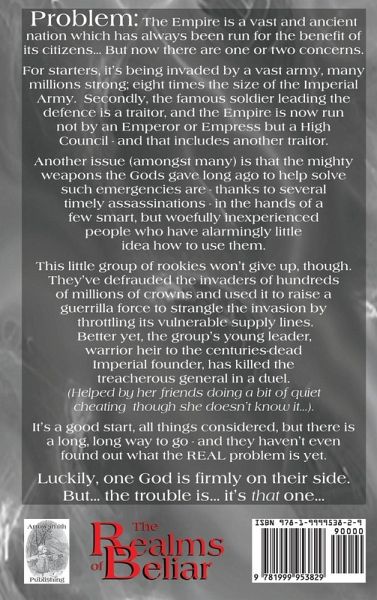 This is the second book of a sequence - sometimes humorous, sometimes very dark - describing the events which would define a world for a millennium or more, seen through the eyes of some of the people around whom the whole thing turned. We follow a small group of inexperienced - but intelligent - people as they strive to stay alive and defend their native land, while making sense of the strange circumstances they find themselves in. They become all too aware that there is far more than their survival at stake, and their vast nation is on the edge of tragedy. In this book we further develop the narrative threads of what, over the series, becomes a vast tapestry whose common features include politics simple and complex, magic, warfare, highly problematical love affairs, interactions of people with wildly differing moral codes and beliefs, and examinations of the way people struggle to deal with some odd and conflicting loyalties. Some of the people we meet along the way include A man who has been dead for millennia, but nonetheless is engaged in a passionate love affair with a goddess nearly all of whose followers have been killed by her own brother to protect her A hugely talented and brilliant nature priest who needs his ego stroking constantly to be able to function at all a seven-foot warrior, notorious as a hand-to-hand blood spiller, who is an academic by inclination and contrives to be loyal simultaneously to senior figures on each side of the conflict. A knight who, despite having saved the cause she serves twice by her own selfless courage believes that she is a traitor to all she cares about. An even more effective knight who nevertheless achieves more for her cause after her defeat and enslavement than ever she did on the field of battle – where she achieved a lot. A nasty young man who rescues a slave from an appalling fate with an act of selfless courage – which he admittedly subsequently turns massively to his advantage... A man who fights for a dark cause, but is driven by a firm morality and set of principles... Plus gods, thieves, company executives (who are also thieves by the nature of their religion), politicians, priests of many kinds, mages of even more varieties, traitors, accountants, fanatical loyalists, and many, many more. The Realms of Beliar series also explores what happens in a society ("The Empire") where there are no sexual politics because there is genuinely no sexual discrimination of any kind and never has been; where – in a world of trolls, elves, orcs, etc – if you suggested one human was a different race from another because of essentially cosmetic differences such as skin shade, you would be laughed at incredulously; where the aristocrats who rule do so for the benefit of the people because otherwise various benevolent deities – very, very real – would remove them from power – and probably life. Of course the Empire isn't the only nation, and other cultures and polities have a range of different approaches to all these things. The interaction between all these viewpoints is really the driving force of the whole course of events, though as the story develops it becomes clear that each story arc is itself part of another, deeper sequence. The whole narrative is embellished throughout by many colour images, fine portraits, maps and line drawings