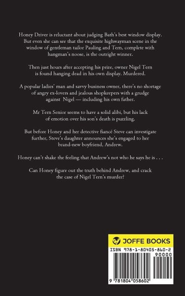 There's something decidedly sinister about the winner of Bath's best window display . . . Is it the hangman's noose or the dead body? Honey Driver is reluctant about judging Bath's best window display. But even she can see that the exquisite highwayman scene in the window of gentleman tailor Pauling and Tern, complete with hangman's noose, is the outright winner. Then just hours after accepting his prize, owner Nigel Tern is found hanging dead in his own display. Murdered. A popular ladies' man and savvy business owner, there's no shortage of angry ex-lovers and jealous shopkeepers with a grudge against Nigel - including his own father. Mr Tern Senior seems to have a solid alibi, but his lack of emotion over his son's death is puzzling. But before Honey and her detective fiancé Steve can investigate further, Steve's daughter announces she's engaged to her brand-new boyfriend, Andrew. Honey can't shake the feeling that Andrew's not who he says he is . . . Can Honey figure out the truth behind Andrew, and crack the case of Nigel Tern's murder?