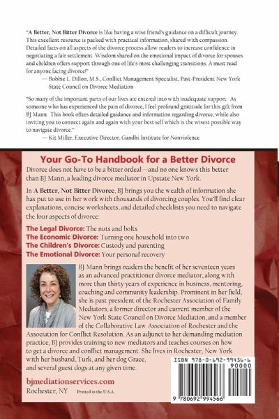 --Your Go-To Handbook for a Better Divorce-- Divorce does not have to be a bitter ordeal—and no one knows this better than BJ Mann, a leading divorce mediator in Upstate New York. In A Better, Not Bitter Divorce: The Fair and Affordable Way to End Your Marriage, BJ brings you the wealth of information she has put to use in her work with thousands of divorcing couples. You’ll find clear explanations, concise worksheets, and detailed checklists you need to navigate the four aspects of divorce: -The Legal Divorce: The nuts and bolts -The Economic Divorce: Turning one household into two -The Children’s Divorce: Custody and parenting -The Emotional Divorce: Your personal recovery --PRAISE FOR A BETTER, NOT BITTER DIVORCE-- "A Better, Not Bitter Divorce is like having a wise friend’s guidance on a difficult journey. This excellent resource is packed with practical information, shared with compassion. Detailed facts on all aspects of the divorce process allow readers to increase confidence in negotiating a fair settlement. Wisdom shared on the emotional impact of divorce for spouses and children offers support through one of life’s most challenging transitions. A must read for anyone facing divorce!" —Bobbie L. Dillon, M.S., Conflict Management Specialist, Past-President New York State Council on Divorce Mediation "So many of the important parts of our lives are entered into with inadequate support. As someone who has experienced the pain of divorce, I feel profound gratitude for this gift from BJ Mann. This book offers detailed guidance and information regarding divorce, while also inviting you to connect again and again with your best self which is the wisest possible way to navigate divorce." —Kit Miller, Executive Director, Gandhi Institute for Nonviolence