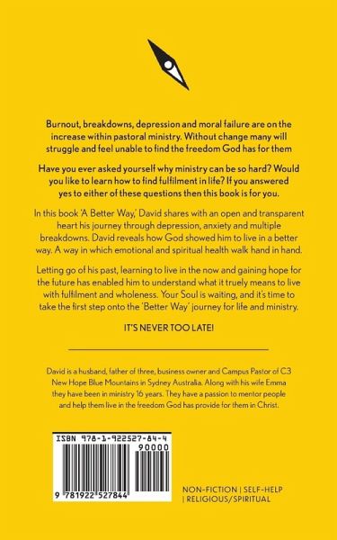 Burnout, breakdowns, depression and moral failure are on the increase within pastoral ministry. Without change many will struggle and feel unable to find the freedom God has for them Have you ever asked yourself why ministry can be so hard? Would you like to learn how to find fulfilment in life? If you answered yes to either of these questions then this book is for you. In this book 'A Better Way,' David shares with an open and transparent heart his journey through depression, anxiety and multiple breakdowns. David reveals how God showed him to live in a better way. A way in which emotional and spiritual health walk hand in hand. Letting go of his past, learning to live in the now and gaining hope for the future has enabled him to understand what it truely means to live with fulfilment and wholeness. Your Soul is waiting, and it's time to take the first step onto the 'Better Way' journey for life and ministry. IT'S NEVER TOO LATE!