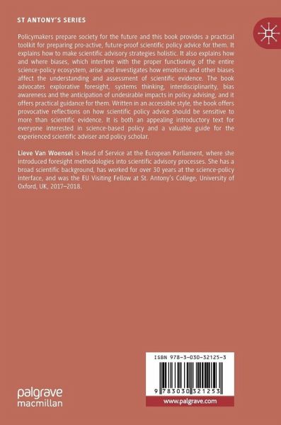 Policymakers prepare society for the future and this book provides a practical toolkit for preparing pro-active, future-proof scientific policy advice for them. It explains how to make scientific advisory strategies holistic. It also explains how and where biases, which interfere with the proper functioning of the entire science-policy ecosystem, arise and investigates how emotions and other biases affect the understanding and assessment of scientific evidence. The book advocates explorative foresight, systems thinking, interdisciplinarity, bias awareness and the anticipation of undesirable impacts in policy advising, and it offers practical guidance for them. Written in an accessible style, the book offers provocative reflections on how scientific policy advice should be sensitive to more than scientific evidence. It is both an appealing introductory text for everyone interested in science-based policy and a valuable guide for the experienced scientific adviser and policy scholar.