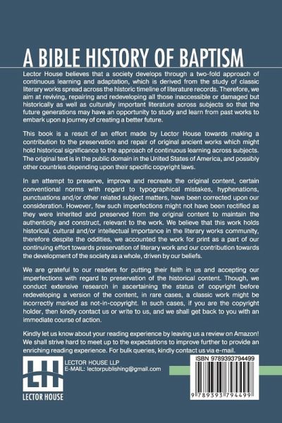 NEW PRINT WITH PROFESSIONAL TYPE-SET IN CONTRAST TO SCANNED PRINTS OFFERED BY OTHERS A Bible History Of Baptism This book is a result of an effort made by us towards making a contribution to the preservation and repair of original classic literature. In an attempt to preserve, improve and recreate the original content, we have worked towards: 1. Type-setting & Reformatting: The complete work has been re-designed via professional layout, formatting and type-setting tools to re-create the same edition with rich typography, graphics, high quality images, and table elements, giving our readers the feel of holding a 'fresh and newly' reprinted and/or revised edition, as opposed to other scanned & printed (Optical Character Recognition - OCR) reproductions. 2. Correction of imperfections: As the work was re-created from the scratch, therefore, it was vetted to rectify certain conventional norms with regard to typographical mistakes, hyphenations, punctuations, blurred images, missing content/pages, and/or other related subject matters, upon our consideration. Every attempt was made to rectify the imperfections related to omitted constructs in the original edition via other references. However, a few of such imperfections which could not be rectified due to intentional\unintentional omission of content in the original edition, were inherited and preserved from the original work to maintain the authenticity and construct, relevant to the work. We believe that this work holds historical, cultural and/or intellectual importance in the literary works community, therefore despite the oddities, we accounted the work for print as a part of our continuing effort towards preservation of literary work and our contribution towards the development of the society as a whole, driven by our beliefs. We are grateful to our readers for putting their faith in us and accepting our imperfections with regard to preservation of the historical content. HAPPY READING!