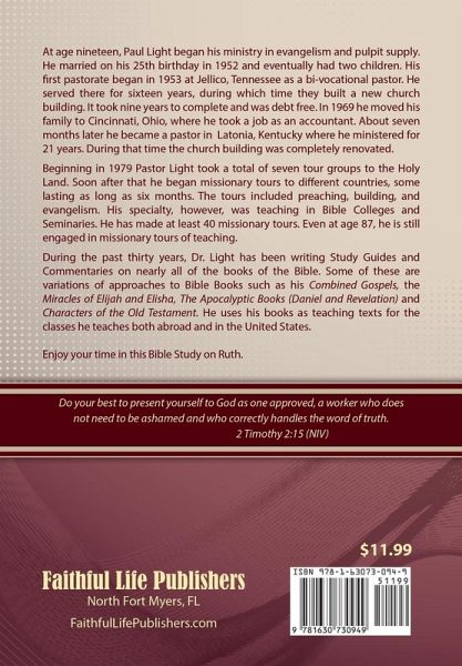 At age nineteen, Paul Light began his ministry in evangelism and pulpit supply. He married on his 25th birthday in 1952 and eventually had two children. His first pastorate began in 1953 at Jellico, Tennessee as a bi-vocational pastor. He served there for sixteen years, during which time they built a new church building. It took nine years to complete and was debt free. In 1969 he moved his family to Cincinnati, Ohio, where he took a job as an accountant. About seven months later he became a pastor in Latonia, Kentucky where he ministered for 21 years. During that time the church building was completely renovated. Beginning in 1979 Pastor Light took a total of seven tour groups to the Holy Land. Soon after that he began missionary tours to different countries, some lasting as long as six months. The tours included preaching, building, and evangelism. His specialty, however, was teaching in Bible Colleges and Seminaries. He has made at least 45 missionary tours. Even at age 87, he is still engaged in missionary tours of teaching. During the past thirty years, Dr. Light has been writing Study Guides and Commentaries on nearly all of the books of the Bible. Some of these are variations of approaches to Bible Books such as his Comparative Gospels, the Miracles of Elijah and Elisha, The Apocalyptic Books (Daniel and Revelation) and Characters of the Old Testament. He uses his books as teaching texts for the classes he teaches both abroad and in the United States. Enjoy this Bible study that will make the Bible Come Alive -- Ruth Bible Study.