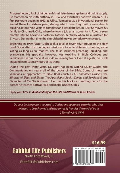 At age nineteen, Paul Light began his ministry in evangelism and pulpit supply. He married on his 25th birthday in 1952 and eventually had two children. His first pastorate began in 1953 at Jellico, Tennessee as a bi-vocational pastor. He served there for sixteen years, during which time they built a new church building. It took nine years to complete and was debt free. In 1969 he moved his family to Cincinnati, Ohio, where he took a job as an accountant. About seven months later he became a pastor in Latonia, Kentucky where he ministered for 21 years. During that time the church building was completely renovated. Beginning in 1979 Pastor Light took a total of seven tour groups to the Holy Land. Soon after that he began missionary tours to different countries, some lasting as long as six months. The tours included preaching, building, and evangelism. His specialty, however, was teaching in Bible Colleges and Seminaries. He has made at least 40 missionary tours. Even at age 87, he is still engaged in missionary tours of teaching. During the past thirty years, Dr. Light has been writing Study Guides and Commentaries on nearly all of the books of the Bible. Some of these are variations of approaches to Bible Books such as his Comparative Gospels, the Miracles of Elijah and Elisha, The Apocalyptic Books (Daniel and Revelation) and Characters of the Old Testament. He uses his books as teaching texts for the classes he teaches both abroad and in the United States. Enjoy this Bible Study on The Life and Works of Jesus Christ.