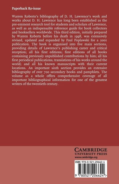 Warren Roberts' Bibliography has long been established as the pre-eminent research tool for students and scholars of Lawrence, and an indispensable reference guide for book collectors and booksellers worldwide. This third edition, initially prepared by Warren Roberts before his death in 1998, was extensively revised and expanded by Paul Poplawski for publication in 2001. It is organised into five main sections, providing full details of Lawrence's publishing career and critical reception; his first editions; first editions of books containing previously unpublished contributions by him; his first periodical publications; translations of his works around the world; and his known manuscripts with their current locations. An important sixth section provides an extensive bibliography of over 600 secondary books and pamphlets. Overall, the volume offers comprehensive coverage of bibliographical information for one of the greatest writers of the twentieth century.