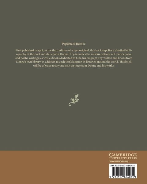First published in 1958 as the third edition of a 1914 original, this book supplies a detailed bibliography of the poet and cleric John Donne. Keynes notes the various editions of Donne's prose and poetic writings, as well as books dedicated to him, his biography by Walton and books from Donne's own library, in addition to each text's location in libraries around the world. This book will be of value to anyone with an interest in Donne and his works.