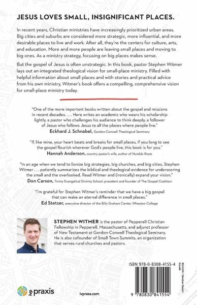 2019 World Magazine Book of the Year Short List 2019 The Gospel Coalition Book Award 2019 Send Institute's Top Ten Church Planting Related Books of 2019 Kevin DeYoung's Top 10 Books of 2019 Jesus loves small, insignificant places. In recent years, Christian ministries have increasingly prioritized urban areas. Big cities and suburbs are considered more strategic, more influential, and more desirable places to live and work. After all, they're the centers for culture, arts, and education. More and more people are leaving small places and moving to big ones. As a ministry strategy, focusing on big places makes sense. But the gospel of Jesus is often unstrategic. In this book, pastor Stephen Witmer lays out an integrated theological vision for small-place ministry. Filled with helpful information about small places and with stories and practical advice from his own ministry, Witmer's book offers a compelling, comprehensive vision for small-place ministry today. Jesus loves small places, and when we care deeply about them and invest in them over time, our ministry becomes a unique picture of the gospel-one that the world badly needs to see.