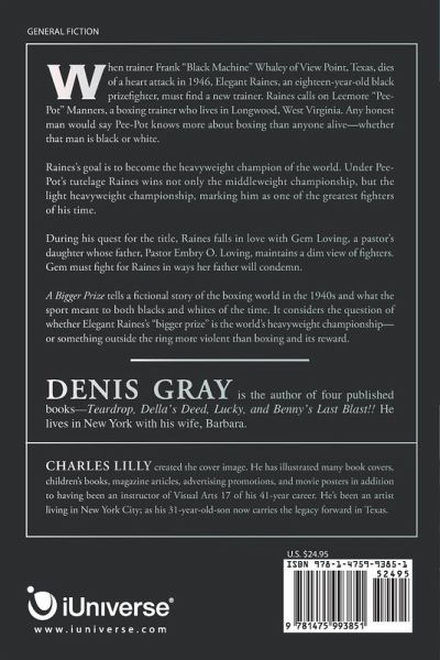 When trainer Frank "Black Machine" Whaley of View Point, Texas, dies of a heart attack in 1946, Elegant Raines, an eighteen-year-old black prizefighter, must find a new trainer. Raines calls on Leemore "Pee-Pot" Manners, a boxing trainer who lives in Longwood, West Virginia. Any honest man would say Pee-Pot knows more about boxing than anyone alive-whether that man is black or white. Raines's goal is to become the heavyweight champion of the world. Under Pee-Pot's tutelage Raines wins not only the middleweight championship, but the light heavyweight championship, marking him as one of the greatest fighters of his time. During his quest for the title, Raines falls in love with Gem Loving, a pastor's daughter whose father, Pastor Embry O. Loving, maintains a dim view of fighters. Gem must fight for Raines in ways her father will condemn. A Bigger Prize tells a fictional story of the boxing world in the 1940s and what the sport meant to both blacks and whites of the time. It considers the question of whether Elegant Raines's "bigger prize" is the world's heavyweight championship-or something outside the ring more violent than boxing and its reward.