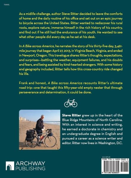 As a midlife challenge, author Steve Ritter decided to leave the comforts of home and the daily routine of his office and set out on an epic journey to bicycle across the United States. Ritter wanted to rediscover his rural roots, explore nature, immerse himself in the rich history of his country, and find out if he still had the endurance of his youth. He wanted to see what other people did every day as he sat at his desk. In A Bike across America, he narrates the story of his thirty-five day, 3,461-mile journey that began April 27, 2013, in Virginia Beach, Virginia, and ended in Newport, Oregon. This travelogue shares Ritter’s thoughts, expectations, and surprises––battling the weather, equipment failures, and his doubts and fears, and being assisted by kind-hearted strangers. With some history and geography included, Ritter tells how this cross-country ride changed his life. Frank and honest, A Bike across America recounts Ritter’s ultimate road trip—one that taught this fifty-year-old empty nester that through perseverance and determination, it could be done.