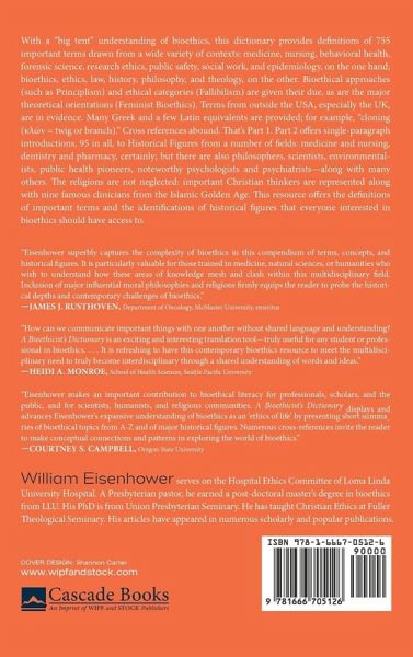 With a "big tent" understanding of bioethics, this dictionary provides definitions of 755 important terms drawn from a wide variety of contexts: medicine, nursing, behavioral health, forensic science, research ethics, public safety, social work, and epidemiology, on the one hand; bioethics, ethics, law, history, philosophy, and theology, on the other. Bioethical approaches (such as Principlism) and ethical categories (Fallibilism) are given their due, as are the major theoretical orientations (Feminist Bioethics). Terms from outside the USA, especially the UK, are in evidence. Many Greek and a few Latin equivalents are provided; for example, "cloning (¿¿¿¿ = twig or branch)." Cross references abound. That's Part 1. Part 2 offers single-paragraph introductions, 95 in all, to Historical Figures from a number of fields: medicine and nursing, dentistry and pharmacy, certainly; but there are also philosophers, scientists, environmentalists, public health pioneers, noteworthy psychologists and psychiatrists--along with many others. The religions are not neglected: important Christian thinkers are represented along with nine famous clinicians from the Islamic Golden Age. This resource offers the definitions of important terms and the identifications of historical figures that everyone interested in bioethics should have access to.
