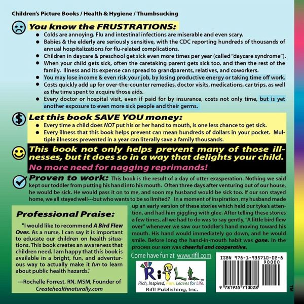 You know the FRUSTRATIONS: ¿ Colds are annoying. Flu and intestinal infections are miserable and even scary. ¿ Babies & the elderly are seriously sensitive, with the CDC reporting hundreds of thousands of annual hospitalizations for flu-related complications. ¿ Children in daycare & preschool get sick even more times per year (called "daycare syndrome"). ¿ When your child gets sick, often the caretaking parent gets sick too, and then the rest of the family. Illness and its expense can spread to grandparents, relatives, and coworkers. ¿ You may lose income & even risk your job, by losing productive energy or taking time off work. ¿ Costs quickly add up for over-the-counter remedies, doctor visits, medications, car trips, as well as the time spent to acquire those aids. ¿ Every doctor or hospital visit, even if paid for by insurance, costs not only time, but is yet another exposure to even more sick people and their germs. Let this book SAVE YOU money: ¿ Every time a child does NOT put his or her hand to mouth, is one less chance to get sick. ¿ Every illness that this book helps prevent can mean hundreds of dollars in your pocket. Multiple illnesses prevented in a year can literally save a family thousands. This book not only helps prevent many of those illnesses, but it does so in a way that delights your child. No more need for nagging reprimands! Proven to work: This book is the result of a day of utter exasperation. Nothing we said kept our toddler from putting his hand into his mouth. Often three days after venturing out of our house, he would be sick. He would pass it on to me, and soon my husband would be sick too. If our son stayed home, we all stayed well---but who wants to be so limited? In a moment of inspiration, my husband made up an early version of these stories which held our tyke's attention, and had him giggling with glee. After telling these stories a few times, all we had to do was to say gently, "A little bird flew over" whenever we saw our toddler's hand moving toward his mouth. His hand would immediately go down, and he would smile. Before long the hand-in-mouth habit was gone. In the process our son was cheerful and cooperative. Professional Praise: "I would like to recommend A Bird Flew Over. As a nurse, I can say it is important to educate our children on health situations. This book creates an awareness that children need. I am happy that this book is available in a bright, fun, and adventurous way to actually make it fun to learn about public health hazards." ---Rochelle Forrest, RN, MSM, Founder of Createhealthnaturally.com For ages 0-8 .