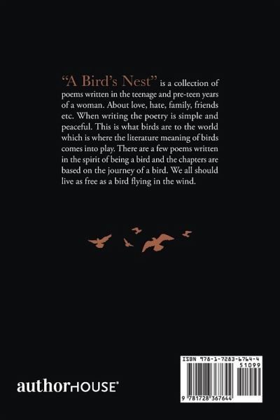 "A Bird's Nest" is a collection of poems written in the teenage and pre-teen years of a woman. About love, hate, family, friends etc. When writing the poetry is simple and peaceful. This is what birds are to the world which is where the literature meaning of birds comes into play. There are a few poems written in the spirit of being a bird and the chapters are based on the journey of a bird. We all should live as free as a bird flying in the wind.