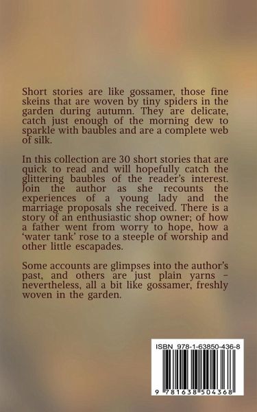 Short stories are like gossamer, those fine skeins that are woven by tiny spiders in the garden during autumn. They are delicate, catch just enough of the morning dew to sparkle with baubles and are a complete web of silk. In this collection are 30 short stories that are quick to read and will hopefully catch the glittering baubles of the reader’s interest. Join the author as she recounts the experiences of a young lady and the marriage proposals she received. There is a story of an enthusiastic shop owner; of how a father went from worry to hope, how a ‘water tank’ rose to a steeple of worship and other little escapades. Some accounts are glimpses into the author’s past, and others are just plain yarns – nevertheless, all a bit like gossamer, freshly woven in the garden.