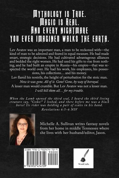 Mythology is True. Magic is Real. And every nightmare you ever imagined walks the earth. Lev Avatov was an important man, a man to be reckoned with-the kind of man to be admired and feared in equal measure. He had made smart, strategic decisions. He had cultivated advantageous alliances and bedded the right women. He had used his gifts to rise from nothing, and he had built an empire in Russia-his empire-that was respected the world over. He had his work, his employees, his possessions, his collections... and his money. Lev flared his nostrils, the height of perturbation for the stoic man. Now it was gone. All of it. Gone! Gone, by way of betrayal. A lesser man would crumble. But Lev Avatov was not a lesser man. I will kill them all... for my trouble. When the Lamb opened the third seal, I heard the third living creature say, "Come!" I looked, and there before me was a black horse! Its rider was holding a pair of scales in his hand. Then I heard what sounded like a voice among the four living creatures, saying, "Two pounds of wheat for a day's wages, and six pounds of barley for a day's wages, and do not damage the oil and the wine!" Revelations 6:5-6 NIV