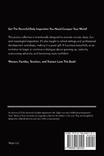 Get The Powerful Daily Inspiration You Need Conquer Your World! This poetry collection is intentionally designed to provide concise, deep, fun, and meaningful inspiration. It's also taught in school settings and professional development workshops, making it a great gift. It functions beautifully as an invitation to begin or continue a dialogue about growing up, maturity, overcoming adversity, and becoming more confident. Women, Families, Teachers, and Trainers Love This Book!