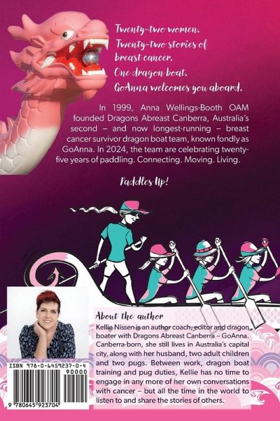 Paddles up! A long silhouette emerges from the mist. The call of the sweep cuts through the dawn silence, the low beat of the drum, and the plink-swoosh-pop of twenty paddles working as one - a rhythmic time stamp on the day. In 1999, Anna Wellings-Booth OAM founded Dragons Abreast Canberra, Australia's second - and now longest-running - breast cancer survivor dragon boat team. GoAnna. In 2024, the team is celebrating twenty-five years of paddling. Connecting. Moving. Living. Many stories have been shared in that time. Stories of courage. Of resilience. Of pain and heartbreak. But inside each story, there is the joy that paddling brings and the sense of belonging. Inside these pages, Kellie Nissen will introduce you to some of the women at the core of Dragons Abreast Canberra, giving you a glimpse into their experiences and a taste of a dragon boat training session. Twenty-two women. Twenty-two stories of breast cancer. One dragon boat. GoAnna welcomes you aboard.