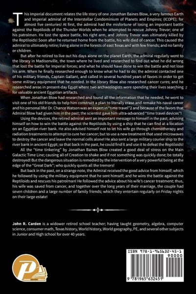 This Imperial document relates the life story of one Jonathan Baines Blow, a very famous Earth and Imperial admiral of the Interstellar Condominium of Planets and Empires; (ICOPE); for almost five centuries! At first, the admiral had the misfortune of losing an important battle against the Reptiloids of the Thunder Worlds when he attempted to rescue Johnny Trevor; one of his patrolmen. He lost the space battle, his right arm, and Johnny Trevor was ultimately killed by the Reptiloids! Soon after he returned home from the battle, his wife died of cancer. This caused the admiral to ultimately retire; living alone in the forests of east Texas and with few friends; and no family or children. But after he retired to live out his days alone on the planet Earth, the admiral regularly went to the library in Madisonville, the town where he lived and researched to find out what he did wrong that lost the battle for Imperial forces; and what he should have done to win the battle and not lose his arm. When he finally researched enough to know what he had to do; the admiral contacted one of his military friends, Captain Gallant, and called in several hundred years of favors in order to get some military equipment that he needed. In the library Blow also researched cancer cures; and he researched areas in present-day Egypt where two archaeologists were spending their lives searching for valuable ancient Egyptian artifacts. When Jonathan Blow had researched and found all the information that he needed, he went to visit one of his old friends to help him construct a plan to literally erase and remake his naval career and his personal life! Dr. Chance Watson was an expert in "time travel"2 and because of the favors that Admiral Blow had given him in the past; the scientist gave him ultra-advanced "time travel devices"! Using the devices, the retired admiral sent an important message to himself in the past; advising himself on how to win the battle against the Reptiloids by using a ship that he can find at a location on an Egyptian river bank. He also advised himself not to let his wife go through chemotherapy and radiation treatments to attempt to cure her cancer; but to use a new treatment that used microwaves to destroy the cancer and leave the normal cells alone! He also sent a large military courier ship to the river bank in ancient Egypt; so that back in the past, he could find it and use it to defeat the Reptiloids! All the "time tinkering" by Jonathan Baines Blow created a good deal of stress on the Main Galactic Time Line; causing all of Creation to shake and if not something was quickly done; be totally destroyed! But the dangerous situation is remedied by the intervention of a very powerful being at the edge of the "Great Dark"; who quickly quiets all the tremors! But back in the past, on a strange note, the Admiral received the good advice from himself; which he followed by using the military equipment that he sent himself; and he wins the battle against the Reptiloids and rescues his patrolman! He followed the advice about his wife's cancer treatment; thus, his wife was saved from cancer, and together over the long years of their marriage, the couple had seven children and a large number of family friends; which they entertain regularly on Friday nights on their large estate!