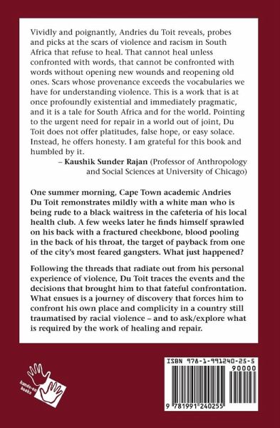 One summer morning, Cape Town academic Andries Du Toit remonstrates mildly with a white man who is being rude to a black waitress in the cafeteria of his local health club. A few weeks later he finds himself sprawled on his back with a fractured cheekbone, blood pooling in the back of his throat, the target of payback from one of the city's most feared gangsters. What just happened? Following the threads that radiate out from his personal experience of violence, Du Toit traces the events and the decisions that brought him to that fateful confrontation. What ensues is a journey of discovery that forces him to confront his own place and complicity in a country still traumatised by racial violence - and to ask/explore what is required by the work of healing and repair.