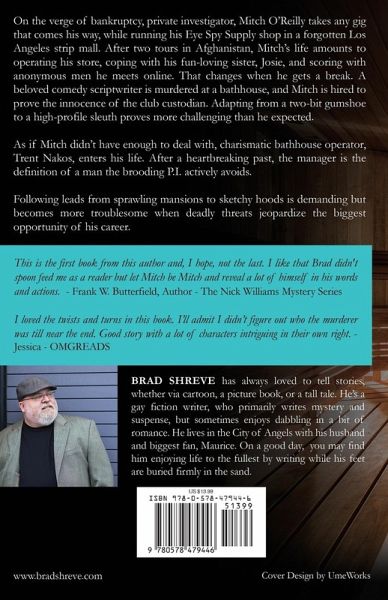On the verge of bankruptcy private investigator Mitch O’Reilly takes any gig that comes his way while running his Eye Spy Supply shop in a forgotten Los Angeles strip mall. After two tours in Afghanistan, Mitch’s life amounts to running his store, coping with his fun-loving sister, Josie, and scoring with anonymous men he meets online. That changes when he gets a break. A beloved comedy scriptwriter is murdered at a bathhouse, and Mitch is hired to prove the innocence of the club custodian. Adapting from a two-bit gumshoe to a high-profile sleuth proves more challenging than he expected. As if Mitch didn’t have enough to deal with, playful bathhouse operator Trent Nakos enters his life. After a heartbreaking past, the manager is the definition of a man the brooding P.I. actively avoids. Following leads from sprawling mansions to sketchy hoods is demanding but becomes more troublesome when deadly threats jeopardize the biggest opportunity of his career.