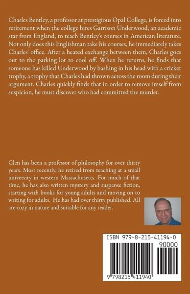 Charles Bentley, a professor at prestigious Opal College, is forced into retirement when the college hires Garrison Underwood, an academic star from England, to teach Bentley's courses in American literature. Not only does this Englishman take his courses, he immediately takes Charles' office. After a heated exchange between them, Charles goes out to the parking lot to cool off. When he returns, he finds that someone has killed Underwood by bashing in his head with a cricket trophy, a trophy that Charles had thrown across the room during their argument. Charles quickly finds that in order to remove imself from suspicion, he must discover who had committed the murder.