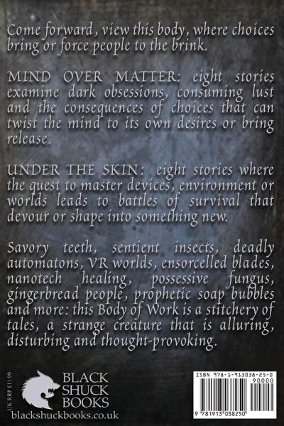 Come forward, view this body, where choices bring or force people to the brink. Mind Over Matter: eight stories examine dark obsessions, consuming lust and the consequences of choices that can twist the mind to its own desires or bring release. Under the Skin: eight stories where the quest to master devices, environment or worlds leads to battles of survival that devour or shape into something new. Savory teeth, sentient insects, deadly automatons, VR worlds, ensorcelled blades, nanotech healing, possessive fungus, gingerbread people, prophetic soap bubbles and more: this Body of Work is a stitchery of tales, a strange creature that is alluring, disturbing and thought-provoking.
