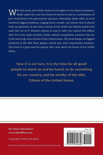 With this book John Burke shares his thoughts on the future of America. Burke makes the case that America's decline is due to a combination of poor leadership in the government and poor citizenship. Burke takes on 14 of America's biggest problems ranging from a health-care system that is almost twice as expensive as any other country in the world and delivers results that rank 55th out of 57 Western nations to how to solve our nation's $34 trillion debt. For every major problem Burke outlines nonpartisan solutions that are in the best long-term interest of the United States. The book brings our biggest problems to life with facts graphs stories and most importantly solutions. This book is a great read for anyone who cares about the future of the United States. Now it is our turn. It is the time for all good people to stand up and be heard to do something for our country and be worthy of the title Citizen of the United States.