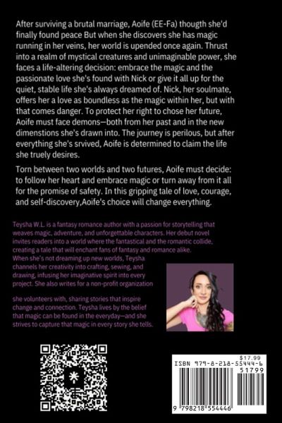 After surviving a brutal marriage, Aoife (EE-fa) thought she'd finally found peace. But when she discovers she has magic running in her veins, her world is upended once again. Thrust into a realm of mystical creatures and unimaginable power, she faces a life-altering decision: embrace the magic and the passionate love she's found with Nick, or give it all up for the quiet, stable life she's always dreamed of. Nick, her soulmate, offers her a love as boundless as the magic within her, but with that love comes danger. To protect her right to choose her future, Aoife must face demons-both from her past and in the new dimensions she's drawn into. The journey is perilous, but after everything she's survived, Aoife is determined to claim the life she truly desires. Torn between two worlds and two futures, Aoife must decide: to follow her heart and embrace the magic, or turn away from it all for the promise of safety. In this gripping tale of love, courage, and self-discovery, Aoife's choice will change everything.
