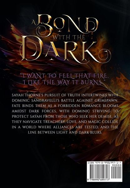 In "A Bond with the Dark," a reluctant witch, Sayah Thorne, finds herself thrust into a world of danger and deception. When her family perishes in a mysterious fire, Sayah's quest for truth leads her on a perilous journey alongside her witch aunts. Meanwhile, Dominic Sangravelli and his siblings battle grimspawn, reanimated dead plaguing their existence. Fate intertwines their destinies when a prophecy designates Sayah as a catalyst for change. Despite opposition from Dominic's vampire family, he is drawn to Sayah, sparking a forbidden romance. But amidst their burgeoning love, dark forces gather, and Sayah becomes the target of those who believe her death will bring about balance. In "A Bond with the Dark," love and magic collide as Sayah and Dominic navigate a treacherous landscape, where betrayal lurks around every corner. Can they defy fate and save their world from impending doom, or will the shadows consume them? Delve into a world of mystery, romance, and supernatural intrigue, where alliances are tested, and the line between light and dark blurs. In "A Bond with the Dark," a reluctant witch, Sayah Thorne, finds herself thrust into a world of danger and deception. When her family perishes in a mysterious fire, Sayah's quest for truth leads her on a perilous journey alongside her witch aunts. Meanwhile, Dominic Sangravelli and his siblings battle grimspawn, reanimated dead plaguing their existence. Fate intertwines their destinies when a prophecy designates Sayah as a catalyst for change. Despite opposition from Dominic's vampire family, he is drawn to Sayah, sparking a forbidden romance. But amidst their burgeoning love, dark forces gather, and Sayah becomes the target of those who believe her death will bring about balance. In "A Bond with the Dark," love and magic collide as Sayah and Dominic navigate a treacherous landscape, where betrayal lurks around every corner. Can they defy fate and save their world from impending doom, or will the shadows consume them? Delve into a world of mystery, romance, and supernatural intrigue, where alliances are tested, and the line between light and dark blurs.