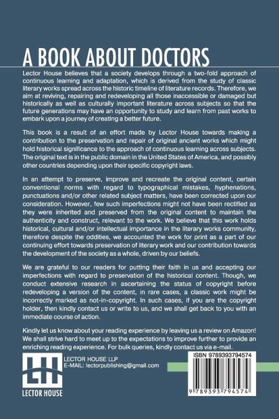 NEW PRINT WITH PROFESSIONAL TYPE-SET IN CONTRAST TO SCANNED PRINTS OFFERED BY OTHERS A Book About Doctors This book is a result of an effort made by us towards making a contribution to the preservation and repair of original classic literature. In an attempt to preserve, improve and recreate the original content, we have worked towards: 1. Type-setting & Reformatting: The complete work has been re-designed via professional layout, formatting and type-setting tools to re-create the same edition with rich typography, graphics, high quality images, and table elements, giving our readers the feel of holding a 'fresh and newly' reprinted and/or revised edition, as opposed to other scanned & printed (Optical Character Recognition - OCR) reproductions. 2. Correction of imperfections: As the work was re-created from the scratch, therefore, it was vetted to rectify certain conventional norms with regard to typographical mistakes, hyphenations, punctuations, blurred images, missing content/pages, and/or other related subject matters, upon our consideration. Every attempt was made to rectify the imperfections related to omitted constructs in the original edition via other references. However, a few of such imperfections which could not be rectified due to intentional\unintentional omission of content in the original edition, were inherited and preserved from the original work to maintain the authenticity and construct, relevant to the work. We believe that this work holds historical, cultural and/or intellectual importance in the literary works community, therefore despite the oddities, we accounted the work for print as a part of our continuing effort towards preservation of literary work and our contribution towards the development of the society as a whole, driven by our beliefs. We are grateful to our readers for putting their faith in us and accepting our imperfections with regard to preservation of the historical content. HAPPY READING!