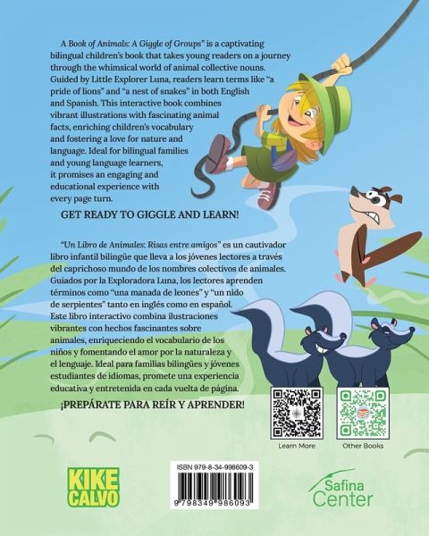 A Book of Animals: A Giggle of Groups" is a captivating bilingual children's book that takes young readers on a journey through the whimsical world of animal collective nouns. Guided by Little Explorer Luna, readers learn terms like "a pride of lions" and "a nest of snakes" in both English and Spanish. This interactive book combines vibrant illustrations with fascinating animal facts, enriching children's vocabulary and fostering a love for nature and language. Ideal for bilingual families and young language learners, it promises an engaging and educational experience with every page turn. GET READY TO GIGGLE AND LEARN! - - - - - - - - - - - - - - - - - - - - - - - - - - - - Un Libro de Animales: Risas entre amigos" es un cautivador libro infantil bilingüe que lleva a los jóvenes lectores a través del caprichoso mundo de los nombres colectivos de animales. Guiados por la Exploradora Luna, los lectores aprenden términos como "una manada de leones" y "un nido de serpientes" tanto en inglés como en español. Este libro interactivo combina ilustraciones vibrantes con hechos fascinantes sobre animales, enriqueciendo el vocabulario de los niños y fomentando el amor por la naturaleza y el lenguaje. Ideal para familias bilingües y jóvenes estudiantes de idiomas, promete una experiencia educativa y entretenida en cada vuelta de página. ¡PREPÁRATE PARA REÍR Y APRENDER!
