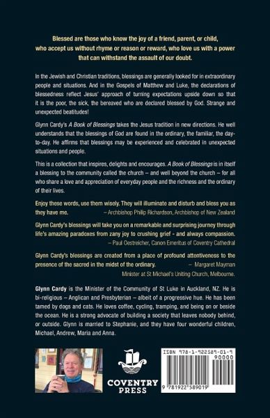 Blessed are those who know the joy of a friend, parent, or child, who accept us without rhyme or reason or reward, who love us with a power that can withstand the assault of our doubt. In the Jewish and Christian traditions, blessings are generally looked for in extraordinary people and situations. And in the Gospels of Matthew and Luke, the declarations of blessedness reflect Jesus' approach of turning expectations upside down so that it is the poor, the sick, the bereaved who are declared blessed by God. Strange and unexpected beatitudes! Glynn Cardy's A Book of Blessings takes the Jesus tradition in new directions. He well understands that the blessings of God are found in the ordinary, the familiar, the day-to- day. He affirms that blessings may be experienced and celebrated in unexpected situations and people. This is a collection that inspires, delights and encourages. A Book of Blessings is in itself a blessing to the community called the church - and well beyond the church - for all who share a love and appreciation of everyday people and the richness and the ordinary of their lives.