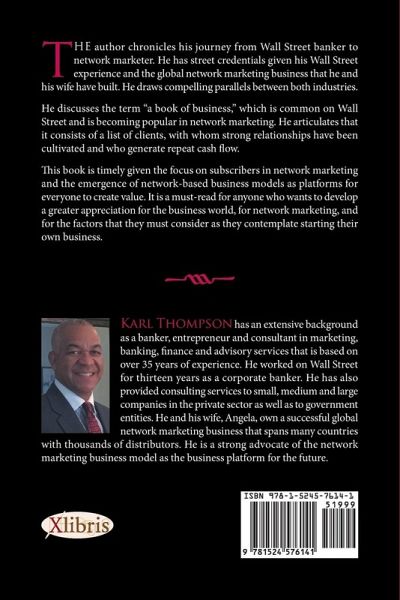 The author chronicles his journey from Wall Street banker to network marketer. He has street credentials given his Wall Street experience and the global network marketing business that he and his wife have built. He draws compelling parallels between both industries. He discusses the term "a book of business," which is common on Wall Street and is becoming popular in network marketing. He articulates that it consists of a list of clients, with whom strong relationships have been cultivated and who generate repeat cash flow. This book is timely given the focus on subscribers in network marketing and the emergence of network-based business models as platforms for everyone to create value. It is a must-read for anyone who wants to develop a greater appreciation for the business world, for network marketing, and for the factors that they must consider as they contemplate starting their own business.