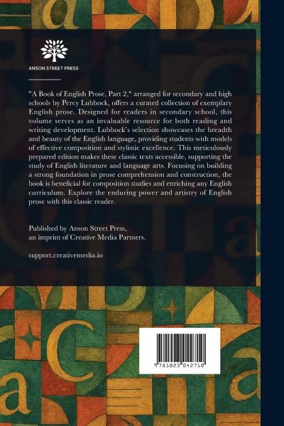 "A Book of English Prose, Part 2," arranged for secondary and high schools by Percy Lubbock, offers a curated collection of exemplary English prose. Designed for readers in secondary school, this volume serves as an invaluable resource for both reading and writing development. Lubbock's selection showcases the breadth and beauty of the English language, providing students with models of effective composition and stylistic excellence. This meticulously prepared edition makes these classic texts accessible, supporting the study of English literature and language arts. Focusing on building a strong foundation in prose comprehension and construction, the book is beneficial for composition studies and enriching any English curriculum. Explore the enduring power and artistry of English prose with this classic reader. This work has been selected by scholars as being culturally important, and is part of the knowledge base of civilization as we know it. This work is in the public domain in the United States of America, and possibly other nations. Within the United States, you may freely copy and distribute this work, as no entity (individual or corporate) has a copyright on the body of the work. Scholars believe, and we concur, that this work is important enough to be preserved, reproduced, and made generally available to the public. We appreciate your support of the preservation process, and thank you for being an important part of keeping this knowledge alive and relevant.