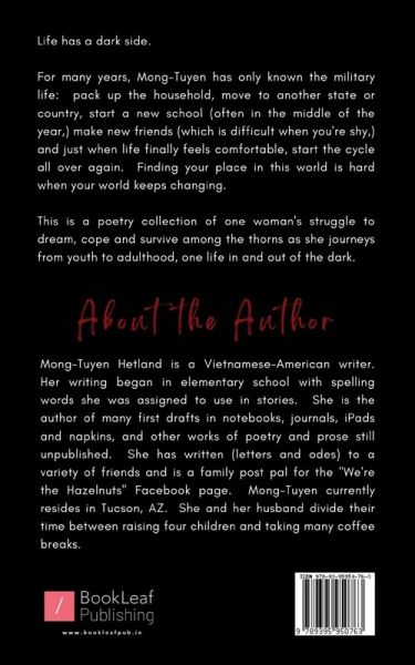 "Life has a dark side. For many years, Mong-Tuyen has only known the military life: pack up the household, move to another state or country, start a new school (often in the middle of the year,) make new friends (which is difficult when you're shy,) and just when life finally feels comfortable, start the cycle all over again. Finding your place in this world is hard when your world keeps changing. This is a poetry collection of one woman's struggle to dream, cope and survive among the thorns as she journeys from youth to adulthood, one life in and out of the dark."