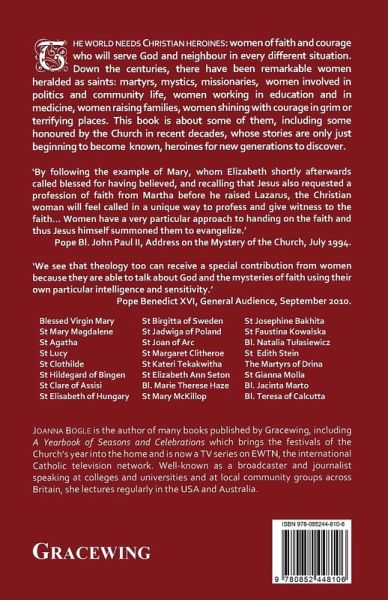 The world needs Christian heroines: women of faith and courage who will serve God and neighbour in every different situation. Down the centuries, there have been remarkable women heralded as saints: martyrs, mystics, missionaries, women involved in politics and community life, women working in education and in medicine, women raising families, women shining with courage in grim or terrifying places. This book is about some of them, including some honoured by the Church in recent decades, whose stories are only just beginning to become known, heroines for new generations to discover.