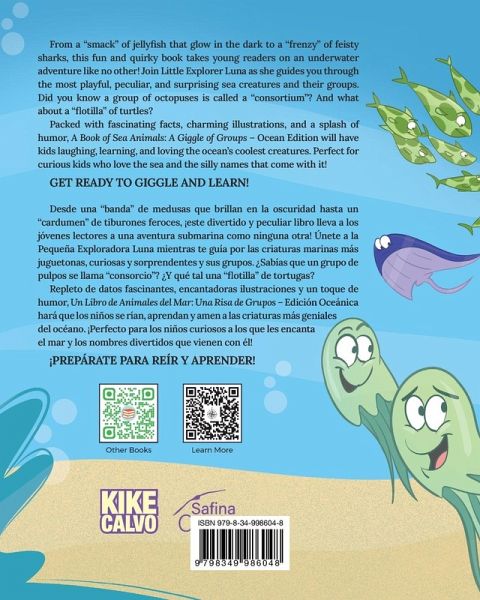 From a "smack" of jellyfish that glow in the dark to a "frenzy" of feisty sharks, this fun and quirky book takes young readers on an underwater adventure like no other! Join Little Explorer Luna as she guides you through the most playful, peculiar, and surprising sea creatures and their groups. Did you know a group of octopuses is called a "consortium"? And what about a "flotilla" of turtles? Packed with fascinating facts, charming illustrations, and a splash of humor, A Book of Sea Animals: A Giggle of Groups - Ocean Edition will have kids laughing, learning, and loving the ocean's coolest creatures. Perfect for curious kids who love the sea and the silly names that come with it! - - - - - - - - - - - - - - - - - - - - - - Desde una "banda" de medusas que brillan en la oscuridad hasta un "cardumen" de tiburones feroces, ¡este divertido y peculiar libro lleva a los jóvenes lectores a una aventura submarina como ninguna otra! Únete a la Pequeña Exploradora Luna mientras te guía por las criaturas marinas más juguetonas, curiosas y sorprendentes y sus grupos. ¿Sabías que un grupo de pulpos se llama "consorcio"? ¿Y qué tal una "flotilla" de tortugas? Repleto de datos fascinantes, encantadoras ilustraciones y un toque de humor, Un Libro de Animales del Mar: Una Risa de Grupos - Edición Oceánica hará que los niños se rían, aprendan y amen a las criaturas más geniales del océano. ¡Perfecto para los niños curiosos a los que les encanta el mar y los nombres divertidos que vienen con él! ¡PREPÁRATE PARA REÍR Y APRENDER!