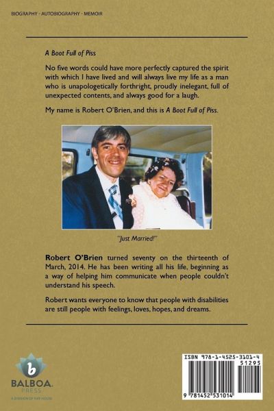 A Boot Full of Piss No five words could have more perfectly captured the spirit with which I have lived and will always live my life as a man who is unapologetically forthright, proudly inelegant, full of unexpected contents, and always good for a laugh. My name is Robert O'Brien, and this is A Boot Full of Piss.