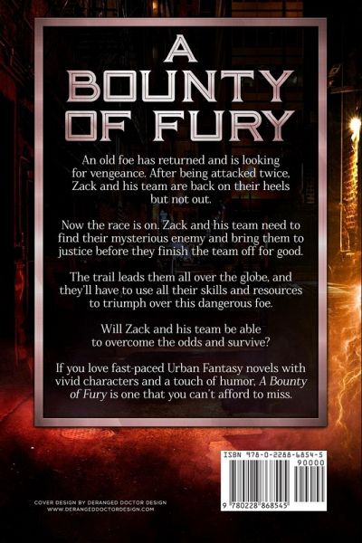 An old foe has returned and is looking for vengeance. After being attacked twice, Zack and his team are back on their heels but not out. Now the race is on. Zack and his team need to find their mysterious enemy and bring them to justice before they finish the team off for good. The trail leads them all over the globe, and they'll have to use all their skills and resources to triumph over this dangerous foe. Will Zack and his team be able to overcome the odds and survive? If you love fast-paced Urban Fantasy novels with vivid characters and a touch of humor, A Bounty of Fury is one that you can't afford to miss. A Bounty of Fury is the sixth book in The Bounty Series.