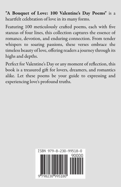 "A Bouquet of Love: 100 Valentine's Day Poems" is a heartfelt celebration of love in its many forms. Featuring 100 meticulously crafted poems, each with five stanzas of four lines, this collection captures the essence of romance, devotion, and enduring connection. From tender whispers to soaring passions, these verses embrace the timeless beauty of love, offering readers a journey through its highs and depths. Perfect for Valentine's Day or any moment of reflection, this book is a treasured gift for lovers, dreamers, and romantics alike. Let these poems be your guide to expressing and experiencing love's profound truths.