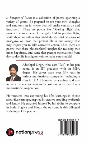 A Bouquet of Poems is a collection of poems spanning a variety of genres. Be prepared to see your own thoughts and emotions set in rhyme that will make you sit up and introspect. There are poems like "Soaring High" that present the treatment of the girl child in a positive light, while there are others that highlight the dark shadows of misogyny or those that present ills in our society, that may inspire you to take corrective action. Then there are poems that share philosophical insights for realizing true inner happiness, and some that present observations from day-to-day life in a lighter vein to make you chuckle!