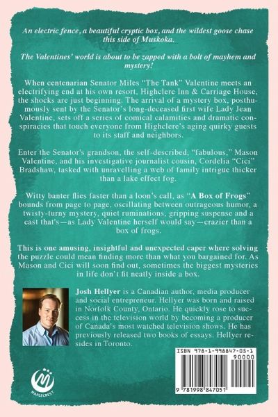 An electric fence, a beautiful cryptic box, and the wildest goose chase this side of Muskoka! The Valentines' world is about to be zapped with a bolt of mayhem and mystery! When centenarian Senator Miles "The Tank" Valentine meets an electrifying end at his own resort, Highclere Inn & Carriage House, the shocks are just beginning. The arrival of a mystery box, posthumously sent by the Senator's long-deceased first wife, Lady Jean Valentine, sets off a series of comical calamities and dramatic conspiracies that touch everyone from Highclere's aging quirky guests to its staff and neighbors. Enter the Senator's grandson, the self-described "fabulous" Mason Valentine, and his investigative journalist cousin, Cordelia "Cici" Bradshaw, tasked with unraveling a web of family intrigue thicker than a lake effect fog. Witty banter flies faster than a loon's call as "A Box of Frogs" bounds from page to page, oscillating between outrageous humor, a twisty-turny mystery, quiet ruminations, gripping suspense, and a cast that's-as Lady Valentine herself would say-crazier than a box of frogs. This is one amusing, insightful, and unexpected caper where solving the puzzle could mean finding more than what you bargained for. As Mason and Cici will soon find out, sometimes the biggest mysteries in life don't fit neatly inside a box.