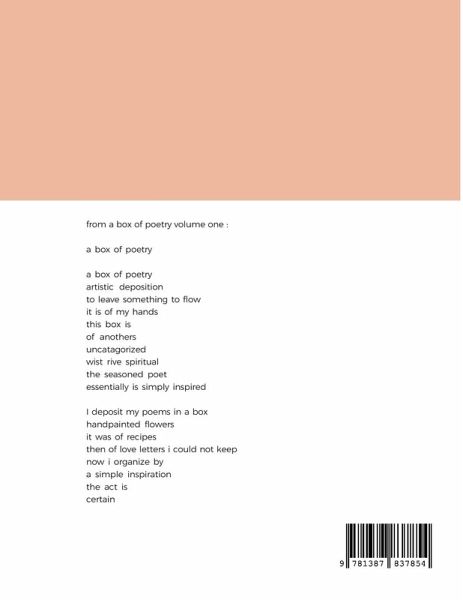 a collection from a box of poetry volume one : a box of poetry a box of poetry artistic deposition to leave something to flow it is of my hands this box is of anothers uncatagorized wist rive spiritual the seasoned poet essentially is simply inspired I deposit my poems in a box handpainted flowers it was of recipes then of love letters i could not keep now i organize by a simple inspiration the act is certain
