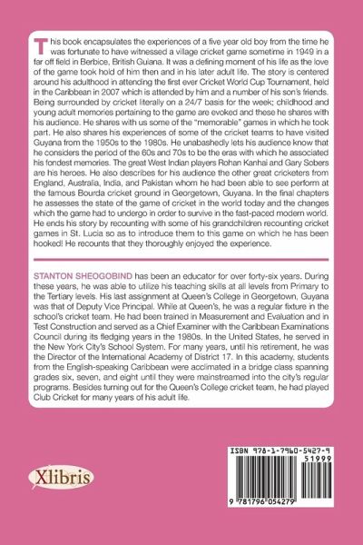 This book encapsulates the experiences of a five year old boy from the time he was fortunate to have witnessed a village cricket game sometime in 1949 in a far off field in Berbice, British Guiana. It was a defining moment of his life as the love of the game took hold of him then and in his later adult life. The story is centered around his adulthood in attending the first ever Cricket World Cup Tournament, held in the Caribbean in 2007 which is attended by him and a number of his son's friends. Being surrounded by cricket literally on a 24/7 basis for the week; childhood and young adult memories pertaining to the game are evoked and these he shares with his audience. He shares with us some of the "memorable" games in which he took part. He also shares his experiences of some of the cricket teams to have visited Guyana from the 1950s to the 1980s. He unabashedly lets his audience know that he considers the period of the 60s and 70s to be the eras with which he associated his fondest memories. The great West Indian players Rohan Kanhai and Gary Sobers are his heroes. He also describes for his audience the other great cricketers from England, Australia, India, and Pakistan whom he had been able to see perform at the famous Bourda cricket ground in Georgetown, Guyana. In the final chapters he assesses the state of the game of cricket in the world today and the changes which the game had to undergo in order to survive in the fast-paced modern world. He ends his story by recounting with some of his grandchildren recounting cricket games in St. Lucia so as to introduce them to this game on which he has been hooked! He recounts that they thoroughly enjoyed the experience.