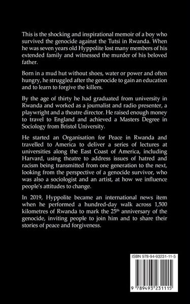 This is the shocking and inspirational memoir of a boy who survived the genocide against the Tutsi. When he was seven years old Hyppolite lost many members of his extended family and witnessed the murder of his beloved father. Born in a mud hut without shoes, water or power and often hungry, he struggled after the genocide to gain an education and to learn to forgive the killers. By the age of thirty he had graduated from university in Rwanda and worked as a journalist and radio presenter, a playwright and a theatre director. He raised enough money to travel to England and achieved a Masters Degree in Sociology from Bristol University. He started a Foundation for Peace in Rwanda and travelled to America to deliver a series of lectures at universities along the East Coast of America, including Harvard, using theatre to address issues of hatred and racism being transmitted from one generation to the next, looking from the perspective of a genocide survivor, who was also a sociologist and an artist, at how we influence people's attitudes to change. In 2019, Hyppolite became an international news item when he performed a hundred-day walk across 1,500 kilometres of Rwanda to mark the 25th anniversary of the genocide, inviting people to join him and to share their stories of peace and forgiveness.