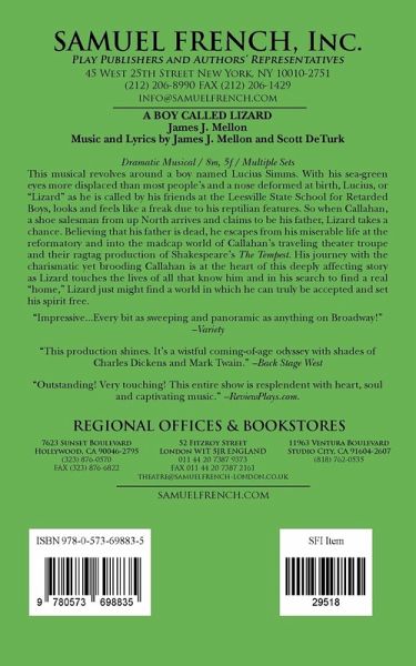 Dramatic MusicalCharacters: 8 male, 5 femaleThis musical revolves around a boy named Lucius Sims. With his sea-green eyes more displaced than most people's and a nose deformed at birth, Lucius, or "Lizard" as he is called by his friends at the Leesville State School for Retarded Boys, looks and feels like a freak due to his reptilian features. So when Callahan, a shoe salesman from up North arrives and claims to be his father, Lizard takes a chance. Believing that his father is dead, he escapes from his miserable life at the reformatory and into the madcap world of Callahan's traveling theater troupe and their ragtag production of Shakespeare's The Tempest. His journey with the charismatic yet brooding Callahan is at the heart of this deeply affecting story as Lizard touches the lives of all that know him and in his search to find a real "home," Lizard just might find a world in which he can truly be accepted and set his spirit free. "Impressive...Every bit as sweeping and panoramic as anything on Broadway!" -Variety. "This production shines. It's a wistful coming-of-age odyssey with shades of Charles Dickens and Mark Twain." -Backstage West. "Outstanding! Very touching! This entire show is resplendent with heart, soul and captivating music." -ReviewPlays.com